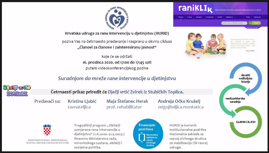 U okviru provedbe trogodišnjeg programa „Obitelji usmjerena rana intervencija u djetinjstvu” (Ministarstvo rada, mirovinskoga sustava, obitelji i socijalne politike), 16. prosinca 2020. g. je Pročitajte više