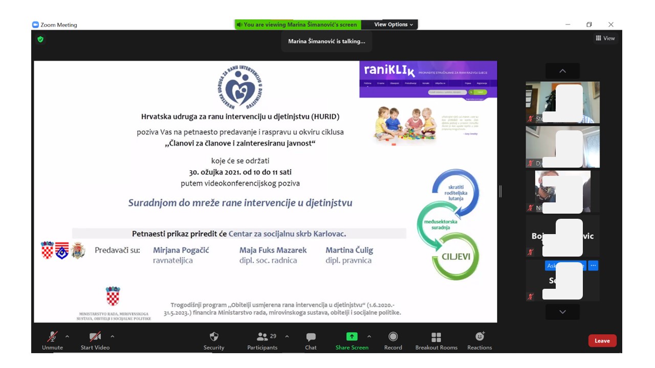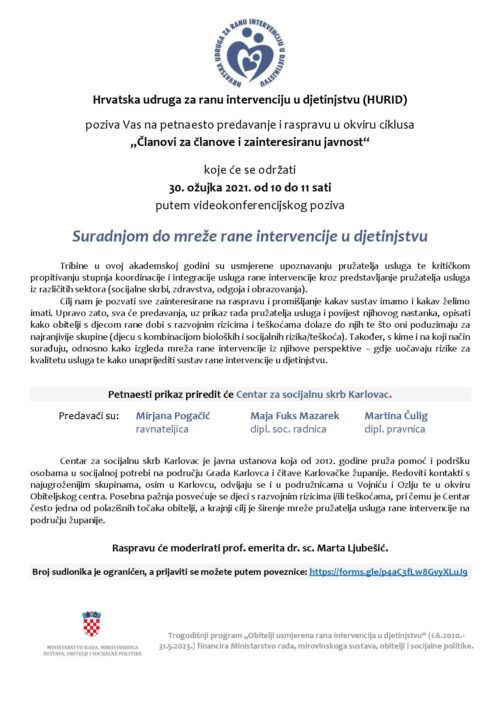 30. ožujka 2021. (utorak) u 10 sati održana je 15. HURID-ova javna tribina (online), s temom Suradnjom do mreže rane intervencije u djetinjstvu. U Pročitajte više