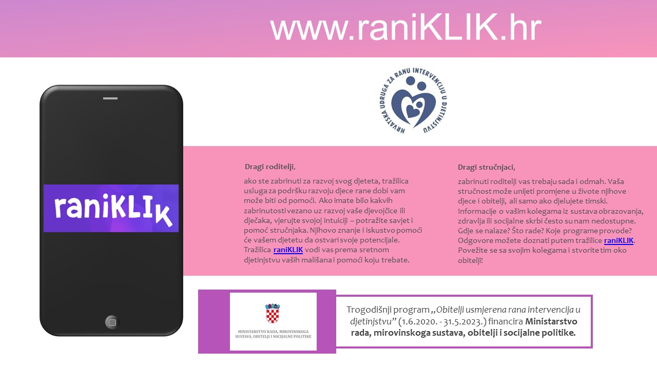 HURID-ova tražilica raniKLIK.hr ima dva cilja: . skratiti roditeljska lutanja; . potaknuti umrežavanje i suradnju stručnjaka. Uključite se i vi! raniKLIK (pdf) Pročitajte više