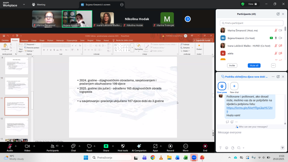U srijedu, 29. listopada 2025. održali smo javnu tribinu i završnu konferenciju, čime smo zaključili provedbu trogodišnjeg programa Podrška obiteljima djece rane dobi s razvojnim rizicima i teškoćama.