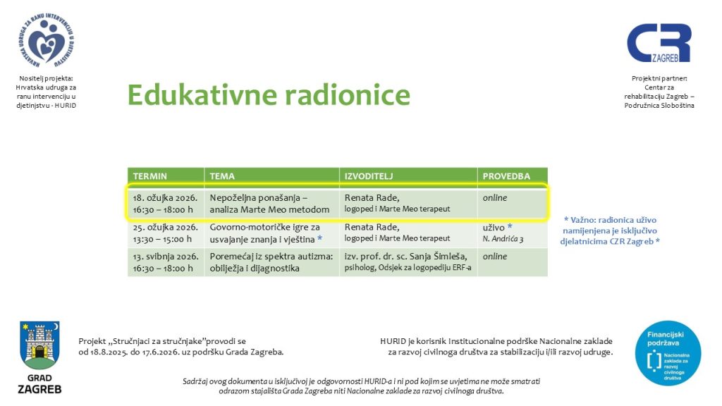Danas smo u okviru projekta “Stručnjaci za stručnjake” koji provodimo uz podršku Grada Zagreba, održali prvu edukativnu radionicu, uz sudjelovanje više od 230 stručnjaka i roditelja.